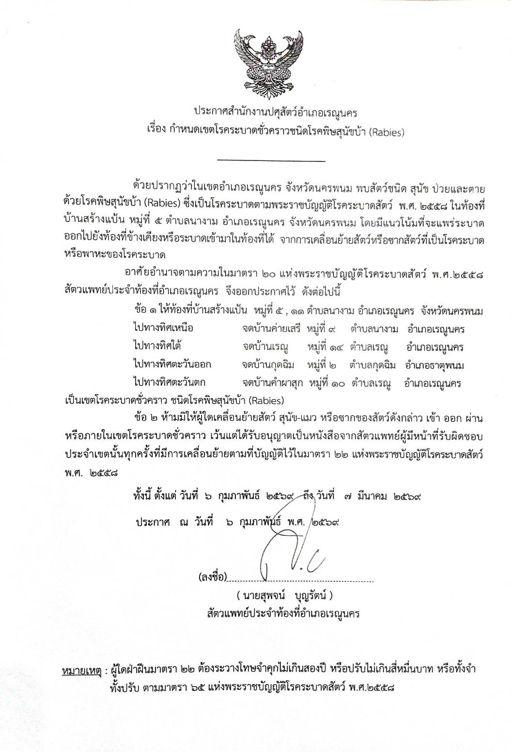 สำนักงานปศุสัตว์อำเภอเรณูนคร ได้ประกาศกำหนดเขตโรคระบาดชั่วคราว ชนิดโรคพิษสุนัขบ้าในสุนัขและแมว ตามพระราชบัญญัติโรคระบาดสัตว์ พ.ศ 2558 เมื่อวันที่ 6 กุมภาพันธ์ พ.ศ 2569 ในพื้นที่บ้านสร้างแป้น หมู่ที่ 5 และหมู่ที่ 11 ตำบลนางาม อำเภอเรณูนคร จังหวัดนครพนม โดยห้ามมิให้ผู้ใดเคลื่อนย้ายสัตว์ สุนัข-แมว หรือซากของสัตว์ดังกล่าว เข้า ออก ผ่าน ภายในเขตโรคระบาดชั่วคราว